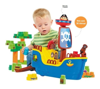 | Baby Land Navio Pirata é um brinquedo super divertido e educativo. O navio, que conta com 30 blocos de montar e 1 boneco pirata, tem plataforma giratória para combater a maré, rodas livres, rampa de carga para armazenar os tesouros, canhão móvel, leme para guiar, posto vigia para detectar os inimigos e uma cartela de adesivos para estimular a imaginação.
