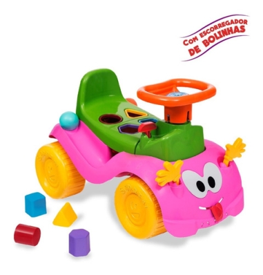 Vem com formas geométricas para encaixar no banco, e um grande diferencial: A Totokinha Bolinha tem um escorregador de bolinhas nas laterais! O bebê coloca a bolinha na lateral, ela escorrega, passa por baixo do assento e sai pelo escapamento! É muito legal!