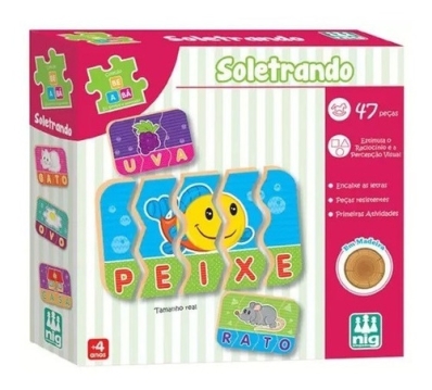 Neste jogo a criança aprende a reconhecer e escrever as palavras brincando. Ela terá que soletrar, encaixar cada letra e formar a palavra e a figura. São 12 palavras com três, quatro ou cinco letras. Contém 47 peças grandes em madeira reciclada, coloridas e resistentes.
