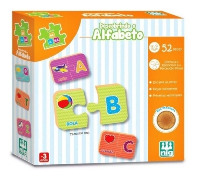 Material didático para crianças em fase pré-escolar; indicado nas listas de material das escolas. Esse jogo traz a associação de cada letra do alfabeto ao objeto que começa com a mesma letra. Encaixes diferentes. Contém 52 peças grandes em madeira reciclada, coloridas e resistentes.